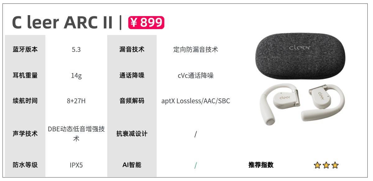 其他方面:音质方面,荣耀亲选 LCHSE配备10.8mm双磁路动圈,动态低音增强和空间环绕声技术,让声音更有方向感和临场感,搭配PEEK+PEN镀钛振膜,降低声音失真和加强低音的表达,做到高音不刺耳,低音动感细腻。同时AI通话降噪,两只高灵敏度麦克风配合AI多通道深度神经网络通话降噪算法,过滤环境噪音,保证通话顺利进行。配置方面,荣耀亲选 LCHSE支持蓝牙5.3,双设备连接,实现双设备连接,切换自如。更有单次续航8h,配备充电仓36h长续航。开放式耳机推荐八:C leer ARC II参考价格:899元推荐理由:亲肤抗菌舒适佩戴,DBE专业动态低音增加技术让声音更动听机型亮点:耳机采用抗菌亲肤材质,保持耳道健康卫生,同时还符合人体工学设计,让耳机更加贴合耳廓。aptX Lossless技术加强音质无损传输,搭配DBE动态低音增强技术增强低音表达,智能调控低频信号的大小。配备蓝牙5.3版本,支持双设备连接且能实现无缝切换。