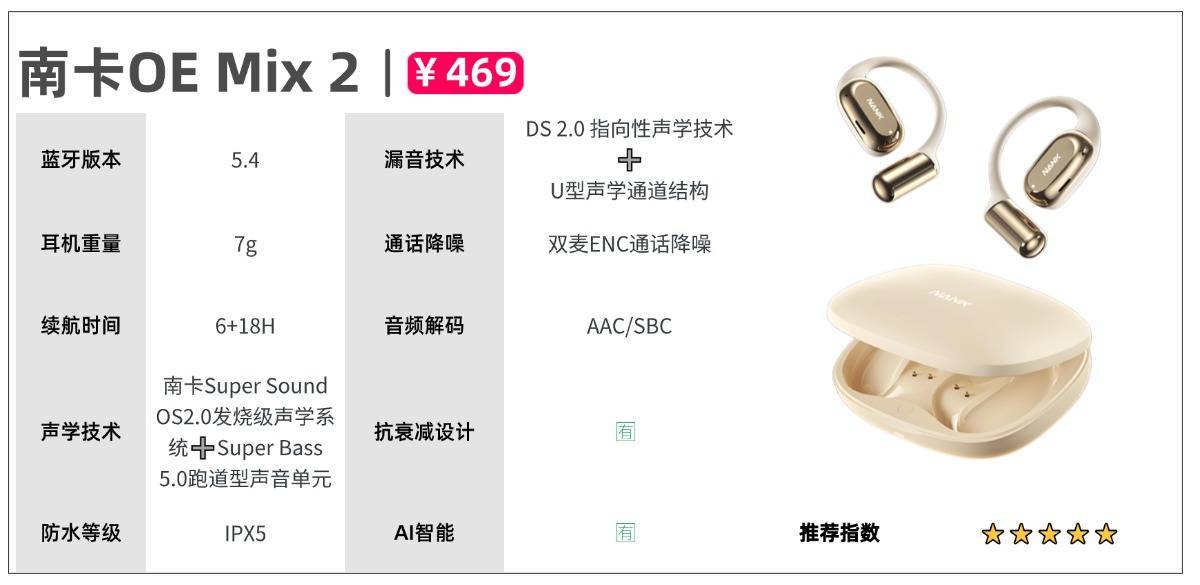 ④优先选择大品牌:大品牌更专业有保障;产品的性能和售后服务较好;建议优先选择Bose、南卡、 JLB、索尼、飞利浦等大品牌。【高性价比耳机推荐】开放式耳机推荐一:南卡OE Mix2参考价格:469元推荐理由:实测表现最好机型,百元价格打造行业里唯一能媲美千元旗舰的款式机型亮点:作为业内公认少数始终坚守匠心精神的专业团队,南卡凭借十余年在开放式音频研发技术的深耕,被广泛认为是该领域技术积淀最深、专业度最高的品牌之一,其工艺水平在行业内稳居第一梯队。不仅获得了专业机构的认证,在用户群体的口碑也是非常能打。这款OE Mix2搭载了Super Bass 5.0跑道型高性能声音单元、OS 2.0发烧级声学系统、6+3维传感空间音频、高定制蓝牙5.4芯片SOC等远超同价位竞品的配置,遥遥领先。