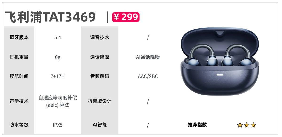 其他看点:Cleer ARC II搭配16.2mm大动圈单元,搭载全新的aptX Lossless无损音频传输技术,高速处理声音。更有DBE专业动态低音增加技术,智能动态调节低频大小。内置六轴传感器,可实现体感操作耳机,还有智能防丢的特有功能。配置方面,Cleer ARC II支持蓝牙5.3版本,多设备蓝牙双连接,设备之间可实现无缝切换。同时接近4倍更高码率蓝牙传输码,高还原音质输出。续航方面,单只耳机巡航8h,搭配充电舱巡航可达35h。开放式耳机推荐九:飞利浦TAT3469参考价格:299元推荐理由:续航时长优秀机型亮点:3D人体工学设计带来的超轻无感佩戴体验,稳固防掉且久戴不压迫,同时搭载蓝牙5.4 保障连接稳定,AI通话降噪技术让嘈杂环境下沟通清晰,配合单次7.5小时、总续航可达38小时的长续航能力及5分钟闪充功能,再加上IPX5防水防汗、定向传音减少漏音的特性,兼顾了实用性与安全性,音质上高低音均衡耐听