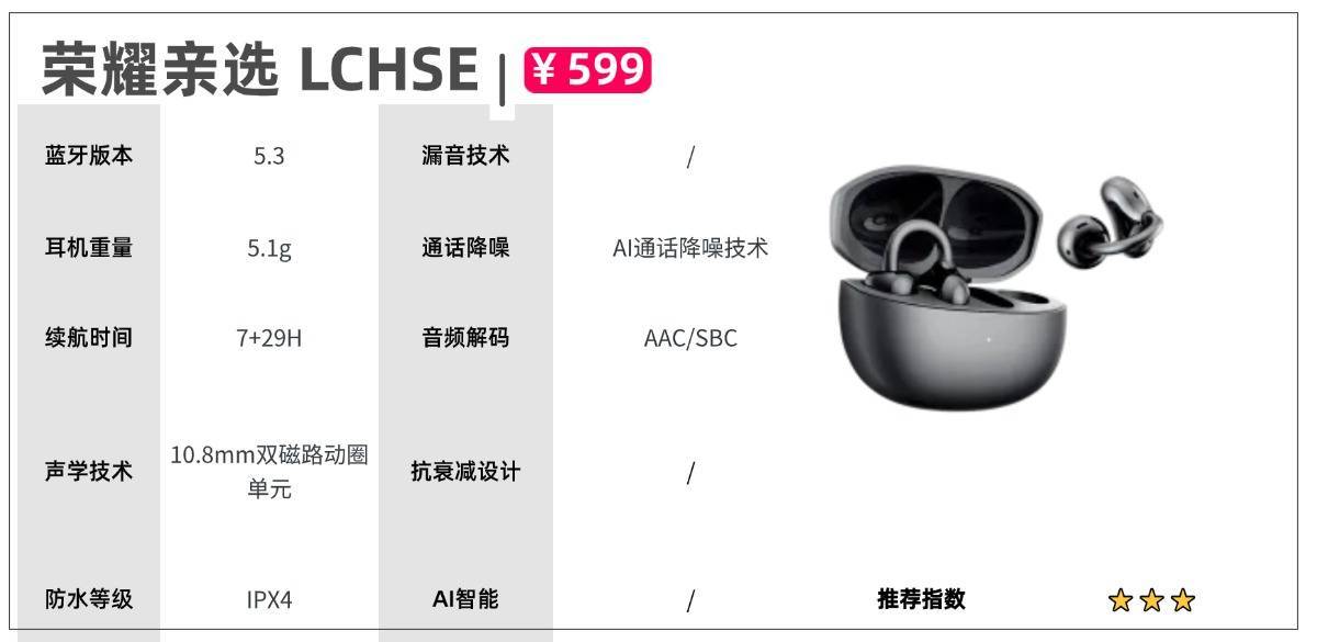 其他方面:音质方面,漫步者Lolli Clip配备13mm大尺寸镀钛动圈单元,高频通透低频强劲,瞬态响应敏捷,开放式设计拓宽声场,空间感自然开阔。声波集束定向结构,有效降低漏音,私享沉浸音效。更有空间音效模式,三维声场构建技术,声场自由扩展,听觉沉浸升级。支持蓝牙6.1,更快、更稳、更省电,在信号复杂的环境,依旧稳如磐石。更有游戏模式下毫秒级超低延迟,声画同步,支持双设备连接开放式耳机推荐七:荣耀 亲选 LCHSE参考价格:599元推荐理由:续航能力出色,声音空间感强机型亮点:单耳仅5.1g,钛合金拱桥结构搭配人体工学设计,久戴无压且运动时稳固不掉,IP54 防尘防水适配多场景;10.8mm 双磁路动圈单元+PEEK+PEN镀钛振膜,配合动态低音增强与定向传音技术,漏音更少,高频通透、低频有力,双麦 AI 降噪保障嘈杂环境通话清晰;蓝牙5.3连接稳定,单次续航7小时、总续航36小时,10分钟快充可听歌2 小时,支持双设备连接。