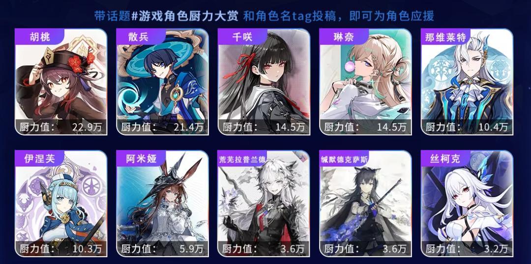 不得不说小破站还是懂节奏的,目前在平台新推出了一个游戏角色厨力大赏的活动,这个活动的话是分为心动角色和萌动角色,其中萌动角色总共有10个角色参加厨力大赏比拼。而目前排在前列的角色分别是散兵和胡桃,胡桃的厨力值来到了22.9万,而散兵是21.4万相差不多,剩下的三四名两位角色则是隔壁小明同学的角色了,第5名是水龙王,厨力值是10.4万,第6名伊涅芙是10.3万,而剩下最后一个原神的角色则是丝柯克,3.2万的厨力值位列游戏榜单的第10名。