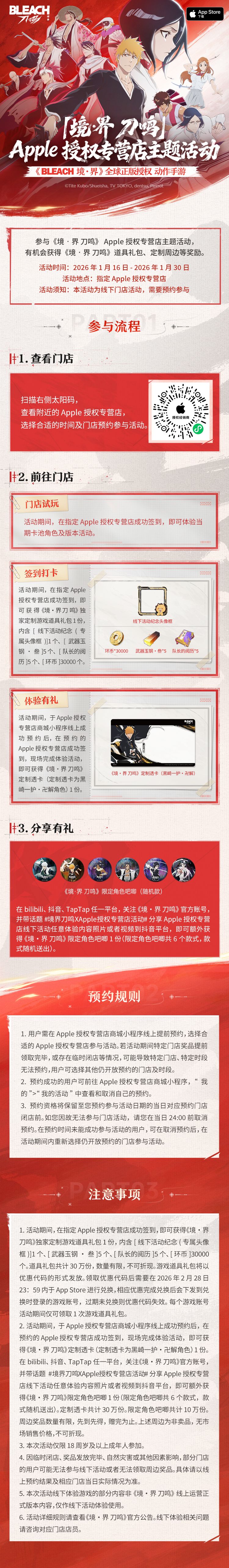 《境·界 刀鸣》携手全国指定2900+家 Apple 授权专营店共同开启线下门店体验活动!前往小程序预约并到线下门店进行试玩体验,即可领取定制透卡、吧唧等官方周边与限定头像框、环币等游戏道具哦~