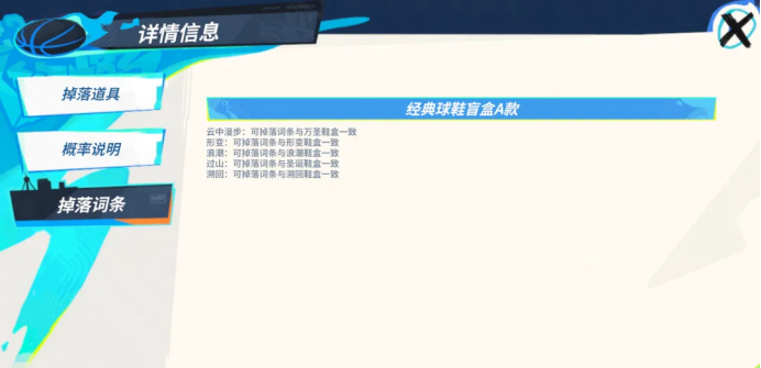 三大盲盒,任你挑选。每款球鞋的获取概率均为20%,每个盲盒开出的球鞋可掉落词条类型与该鞋盒对应的常驻词条池保持一致。打开相应盲盒必得其中一款带词条的金色品质球鞋。