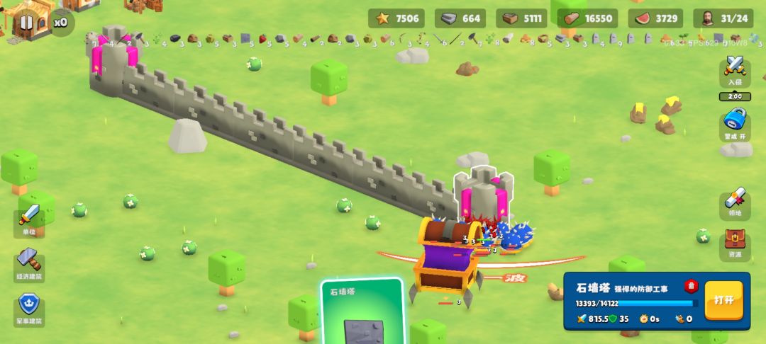 这把还成功避免卡顿,之前玩到后期每把必然卡掉点什么且游戏必须重启;之前喜欢给所有经济类建筑都起出来,想一边给所有增益点满一边开图;这次选择极简操作:木材作坊绕大本围一圈,造一个石材作坊造够石头就删,所有工人只做木制装备开图用,石墙上下左右延伸几个就行,多了会卡