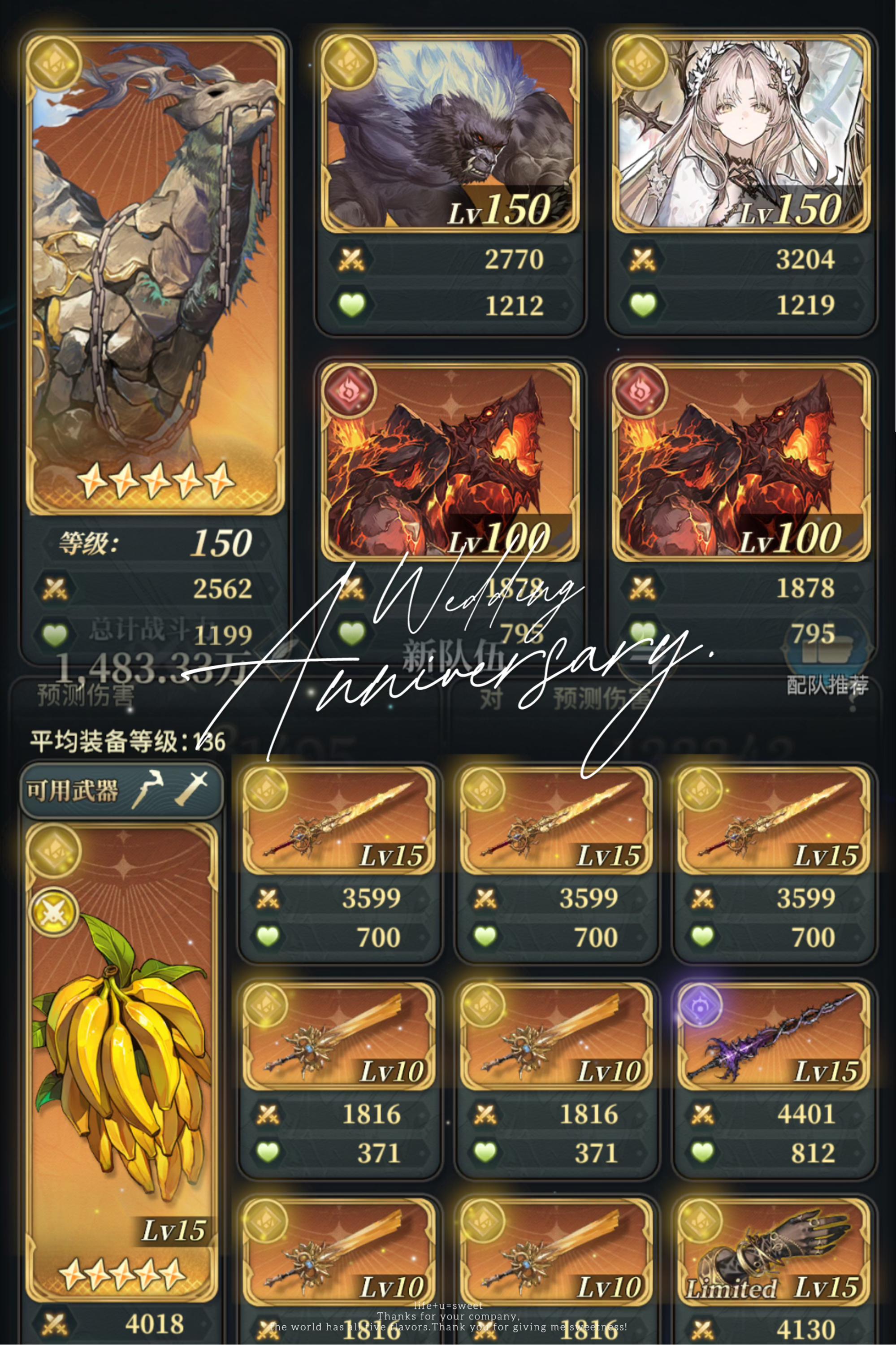 阵容搭配如两种,新手日常优先【奥义/暴击/连击】香蕉(好刷),武器类型优先考虑剑,因为法主武器类型是剑/杖,且法师比较通用,其他主要手搓,会看乘区再搭配,运气好可以铺满土始源拳套,不然放一个就好,留一个位置放黑叔叔武器(必放),