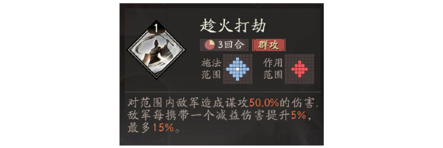 范围攻击搭配:抹书相间+四胜决机+趁火打劫