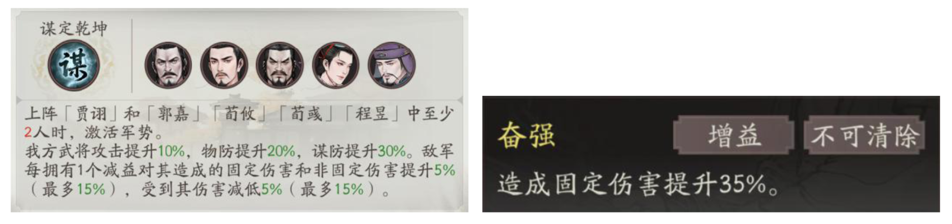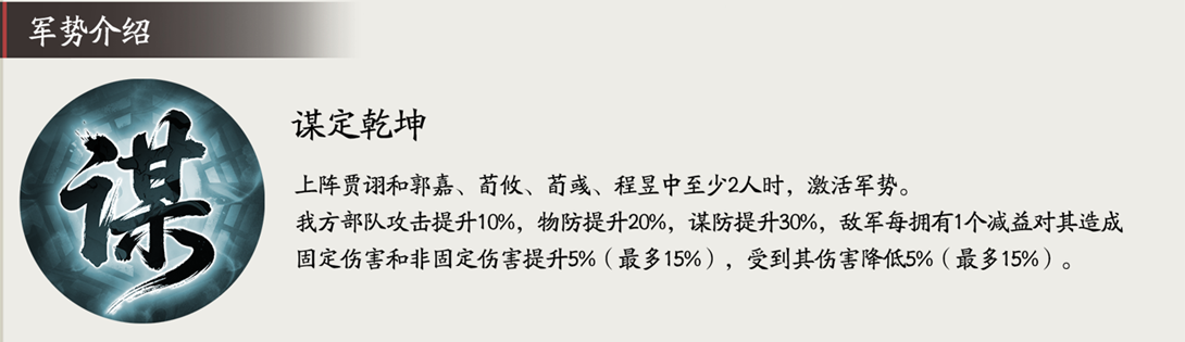 目前游戏内唯一包含固伤增伤的军势,且额外拥有减伤,与荀攸军势相比不管是触发门槛还是效果都更胜一筹。但须绑定指定4人中的2人方可生效,其中仅程昱与贾诩有一定相性,其他3位一般。军势启用名单中没有陈登是减分项。