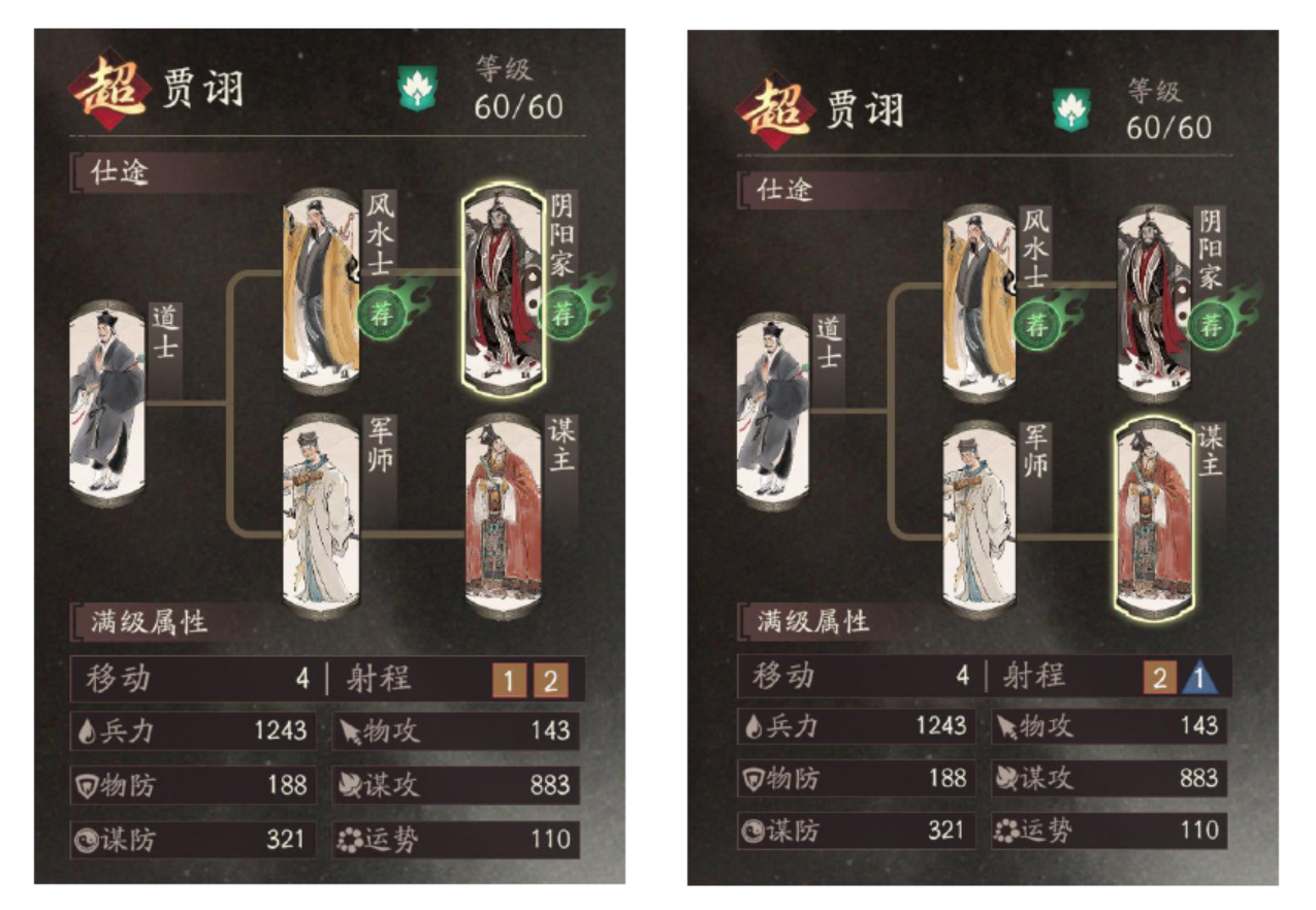 与游戏内推荐一致,贾诩推荐单走阴阳家路线,谋主路线仅精通四可考虑交龙骧之印*1拿「料敌决胜」。若仅把贾诩作为工具人停留在升迁二,不往高迁跑片,该龙骧可先不交,待必要环境缺这一层毒时再交。