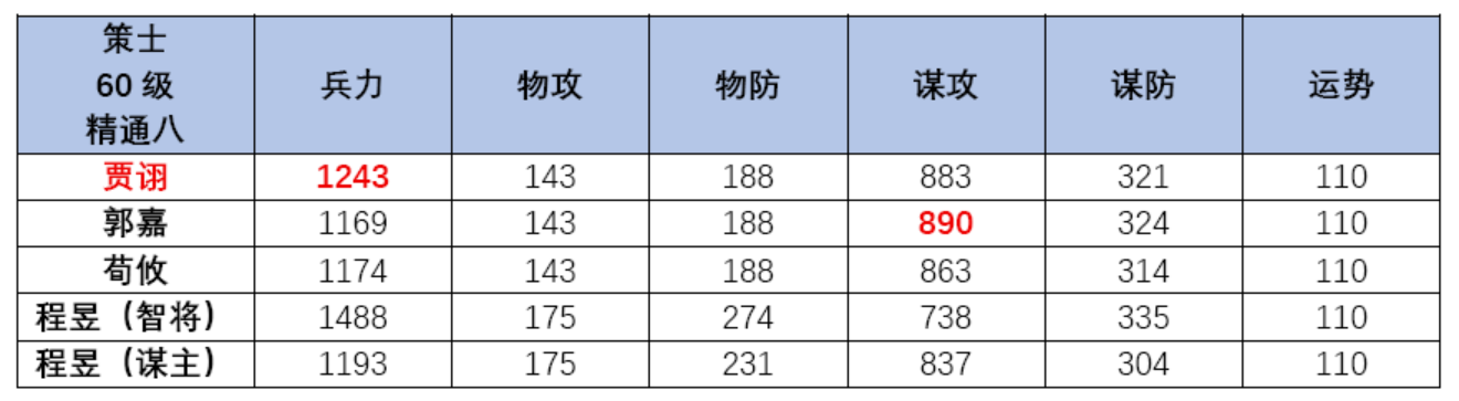通过主流策士角色横向对比可知,贾诩在以上角色中: