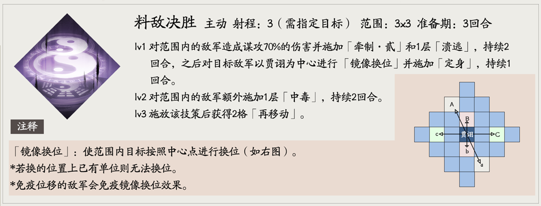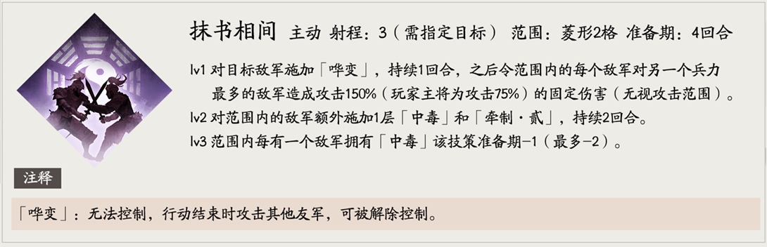 Lv2:额外给1层[中毒]及牵制二,至此贾诩所有专属技都带范围牵制二效果。