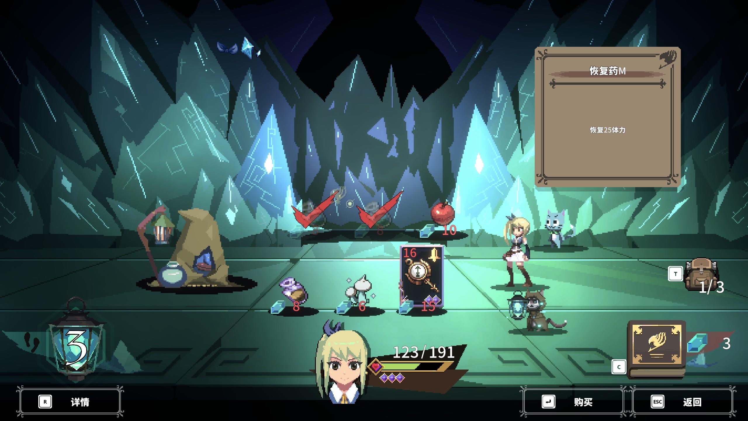虽然只有5个角色,但是在构筑上本作还是有一定的说法的,围绕着5位倾向不同的角色,进行不同的构筑也是本作的乐趣之一。像纳兹,是一个比较水桶腰的角色,可以围绕着攻击或者生存进行搭配,格雷则主要是围绕着防御,我个人觉得露西是叠加buff和提供减益的辅助,每次进行探索携带不同的道具,摸到不同的手牌,都能拓开一条新路,这也是肉鸽游戏的魅力所在。