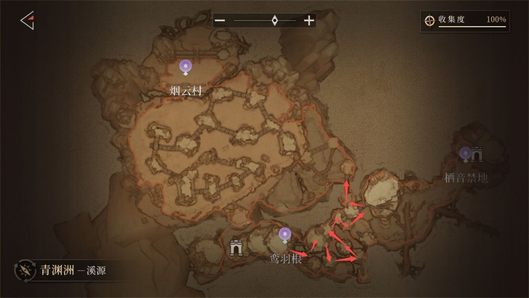 - 路线:从「鸾羽根」按截图指引前往「烟云村」(该区域不在主线内,易遗漏)