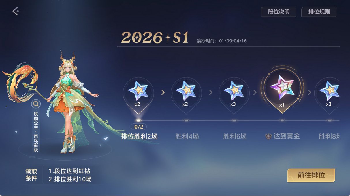 新赛季排位达到红钻并胜利10场,即可免费领取铁扇公主新皮肤【百鸟衔秋】