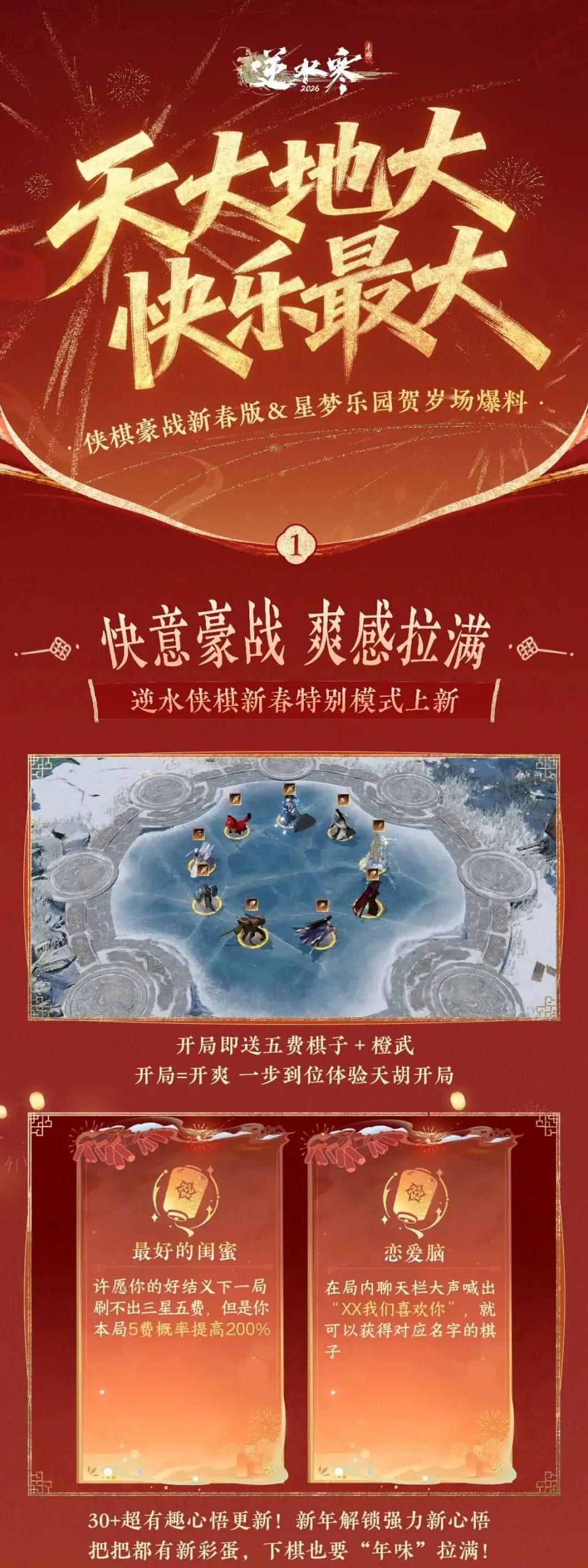逆水侠棋豪战新春版迎来全方位升级,开局选秀环节一改以往设定,棋子将全部替换为5费棋子与橙色武器,玩家从开局就能体验高费阵容的乐趣,同时选秀中还会随机出现2星4费棋子或3星3费棋子,让3星5费棋子的达成成为可能。此外,玩法还加入了全局红包机制,所有玩家的升级、刷新、升星等操作会共同积累红包进度,进度满额后将开启局内大红包,奖励由全场玩家共享。局内还新增30余种春节主题心悟,诸如“提前放假”“压岁钱增长”“没有寒假作业”等趣味内容,进一步增添新春游玩的趣味性。
