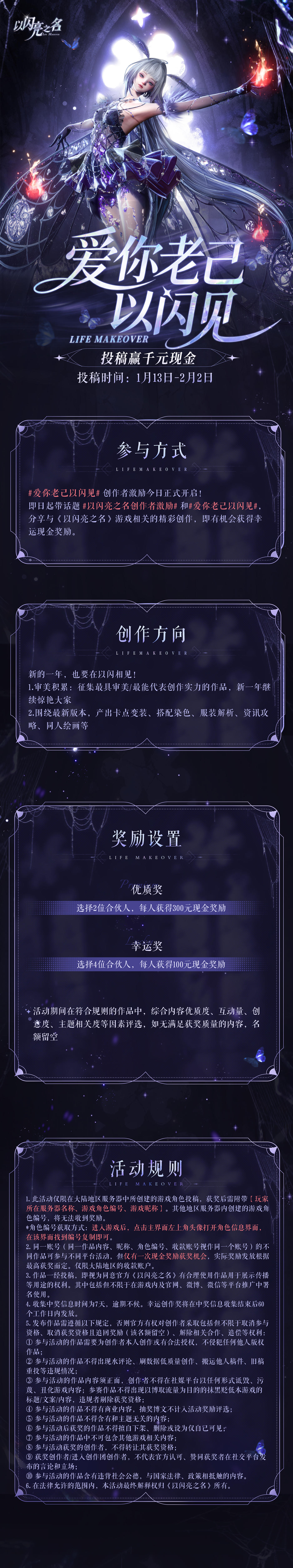 即日起带话题#以闪亮之名创作者激励 和 #爱你老己以闪见 ,分享与《以闪亮之名》游戏最新版本相关的精彩创作,即有机会获得现金奖励。优秀作品有机会上线《以闪亮之名》官网展示,成为万千玩家追捧的闪亮之作!优秀创作者还有机会加入官方创作团,参与专属创作活动,获得更多流量扶持!