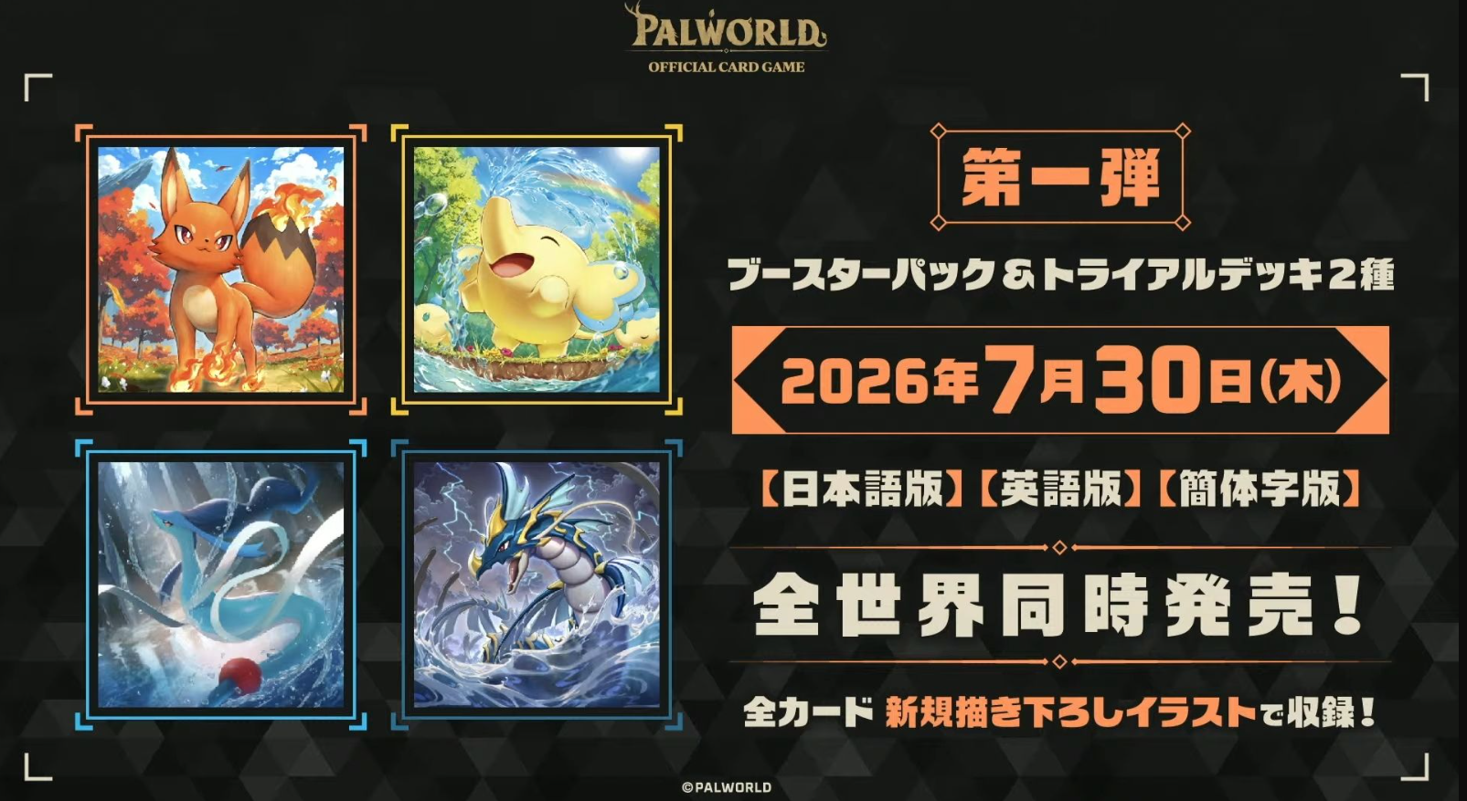 据GameWatch报道,知名娱乐公司武士道正式官宣,将推出《幻兽帕鲁 官方卡牌游戏》,这款基于热门生存动作游戏世界观的集换式卡牌(TCG),定于2026年7月30日全球同步发售,首发即涵盖日文、英文及简体中文版本。