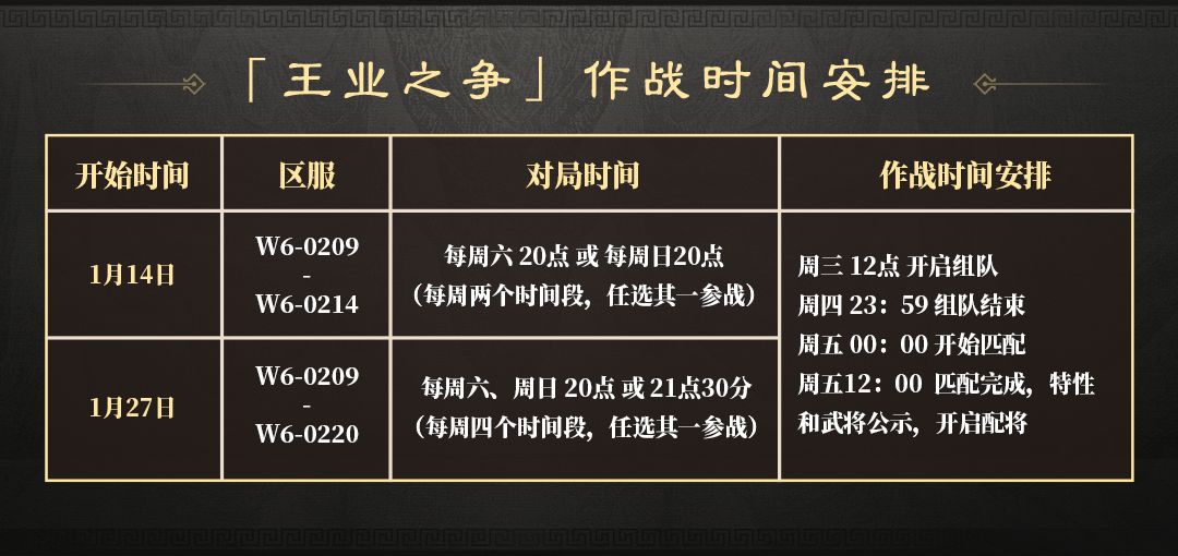 部分区服主公可以在1月起体验到「王业之争」,以下是具体安排,请各位主公注意规划时间,做好作战安排哦!