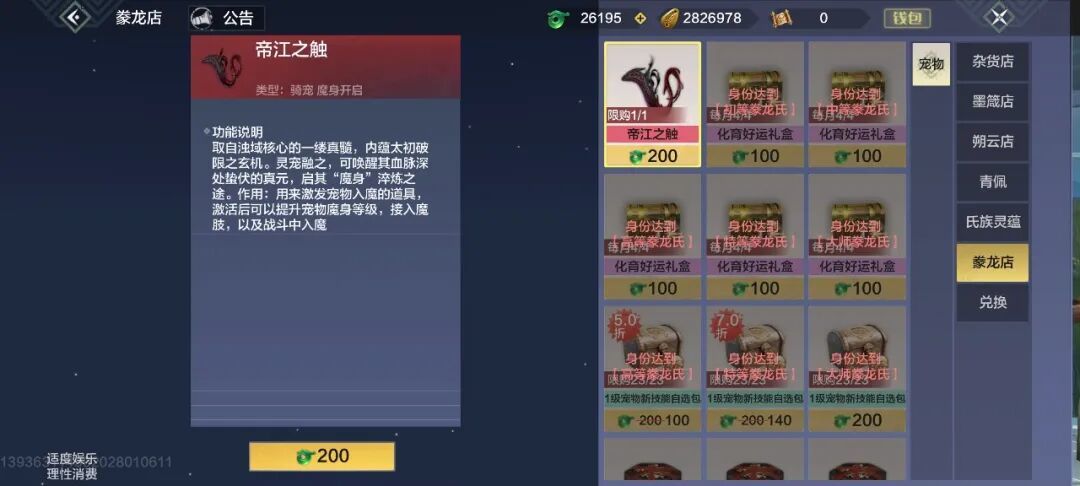 2、55级玩家在豢龙氏商店可花费200脂玉购买一次(家园貔貅台可直接打开商店)