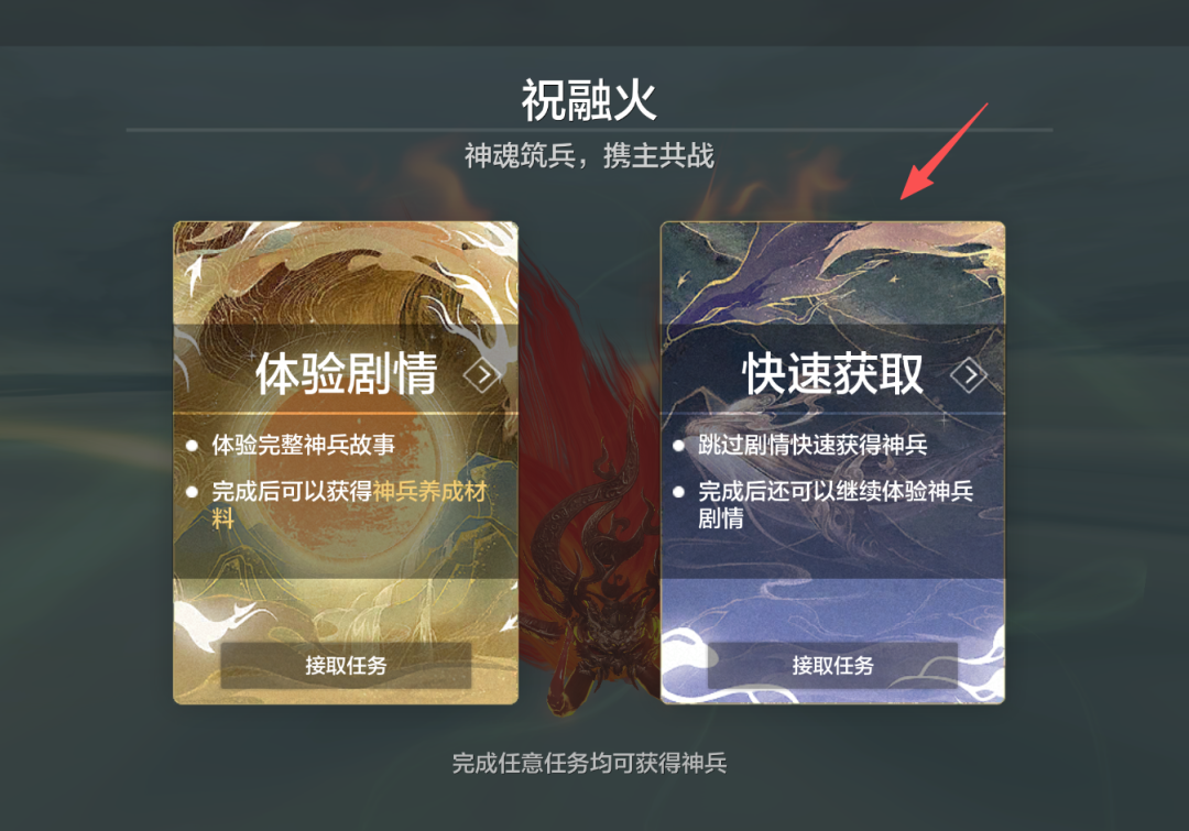 温馨提示:旅者们可以通过【角色-神兵-获取神兵-快速获取】功能直接领取到神兵,后续有空的话记得完整体验剧情任务,可以获得神兵养成资源哦~