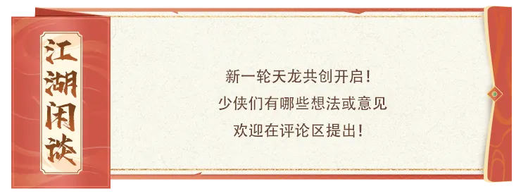 此外,值此盛会前夕,我们也同步启动新一轮天龙共创计划——无论你是否能亲临现场,你的每一个想法、每一条建议,都对江湖的未来至关重要。