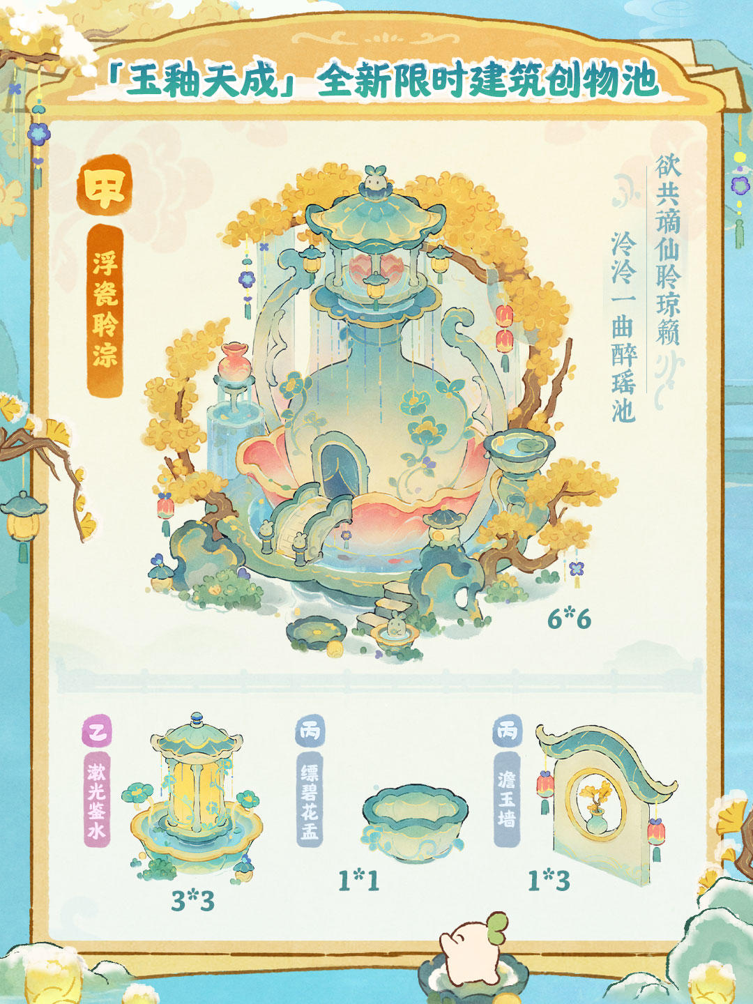 本期限时UP建筑创物池将会上架甲等建筑「浮瓷聆淙」。该建筑不仅能在藏品室中陈列展示瓷珍,还能制作浮桥「青珉台」、解锁「水域·釉岸」,更有拼釉花小游戏、建筑易华彩功能和全新头像框期待大家探索!此外,乙等建筑「漱光鉴水」,丙等建筑「缥碧花盂」「澹玉墙」也将上架。