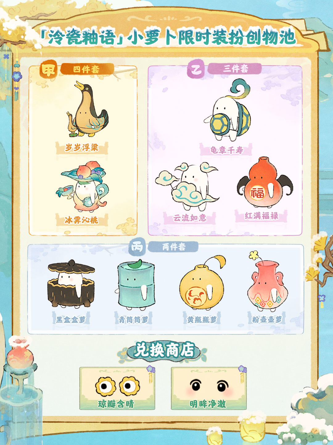 听釉始知松壑雨,叩瓷恍见雪涛笺。本期装扮创物池将上架两套甲等装扮「岁岁浮梁」和「冰霁沁桃」,同时还有三套乙等全新装扮和四套丙等全新装扮,也会一并进入创物池!此外,兑换商店也将上架两款面饰供大家选购。