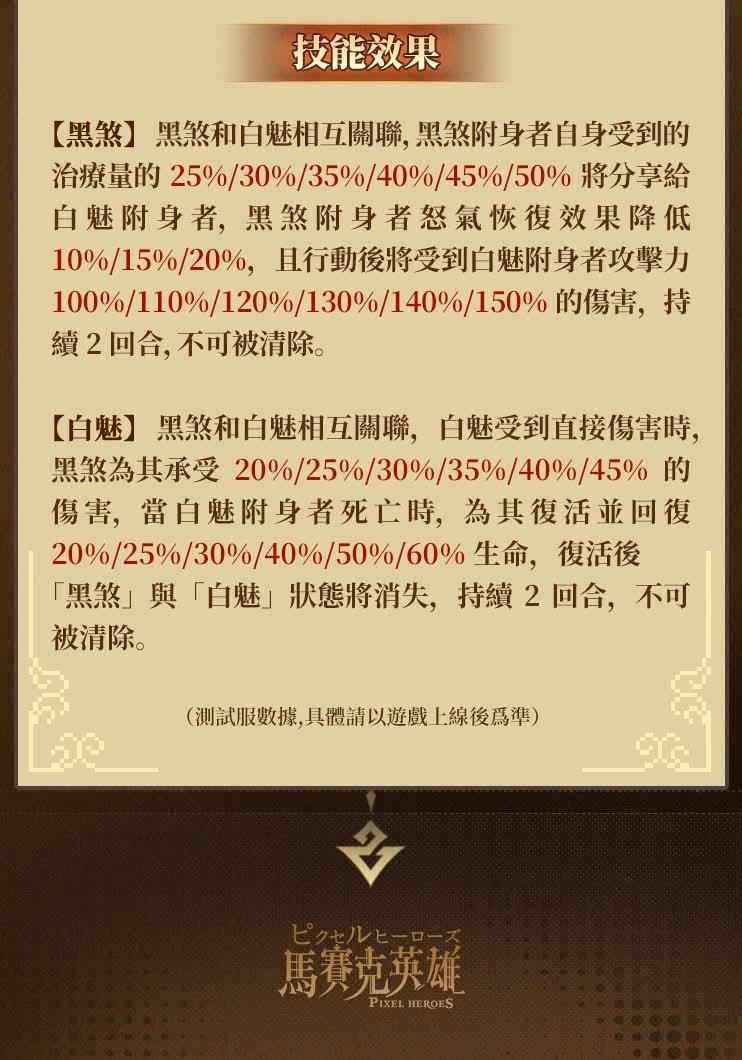 技能效果:雙生魂合力釋放魔力對敵方攻擊最高的目標造成468%/515%/585%/679%/819%/936%的無視護盾的傷害,额外對目標造成生命上限4%/4%/6%/8%/10%的真實傷害(不超過攻擊力的3/4倍)。減少目標30/40/50/60/70/80點怒氣並為其附身【黑煞】,為觸發者附身【白魅】,黑煞和白魅附身時,無視免疫或抵消效果。若觸發者為【魔法】或【輔助】(輔助需11星解鎖),则自身增加50點怒氣,技能釋放後冷卻3/2回合。