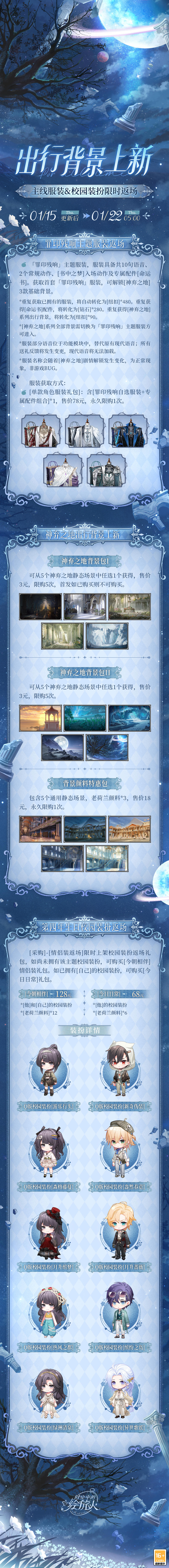 ★1月15日更新后 - 1月22日05:00,「离开苹果园之前」活动开启。活动期间,[采购]-[苹果园]将上架活动礼包和新出行背景,复刻往期出行背景和服装。