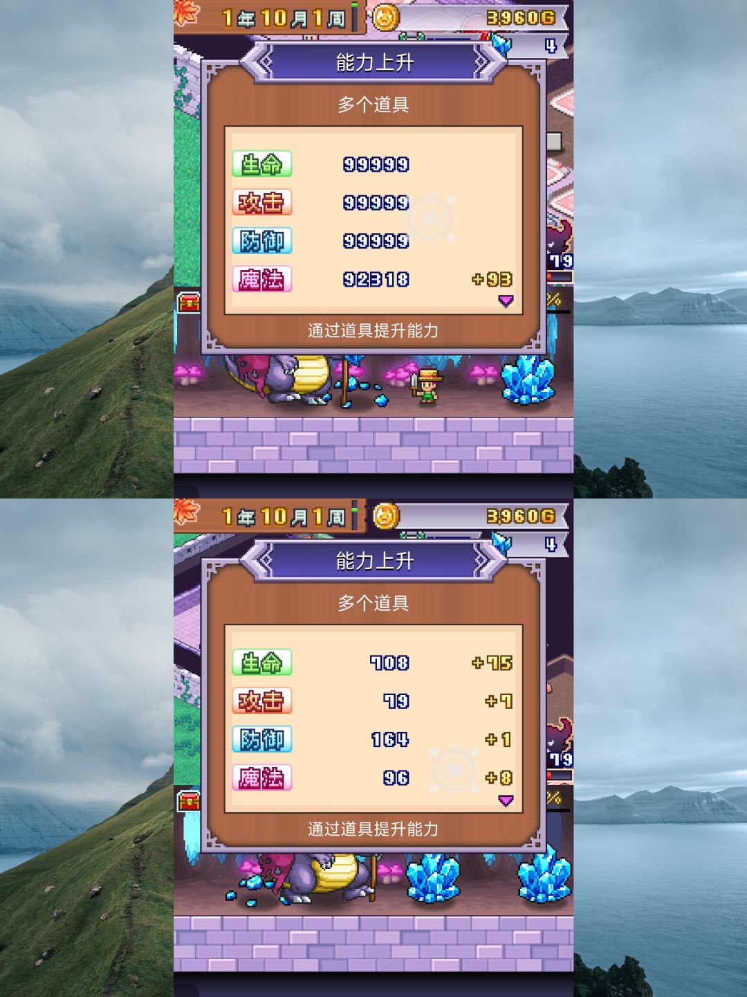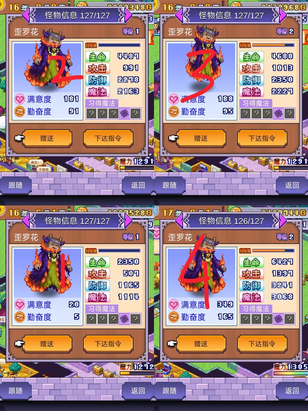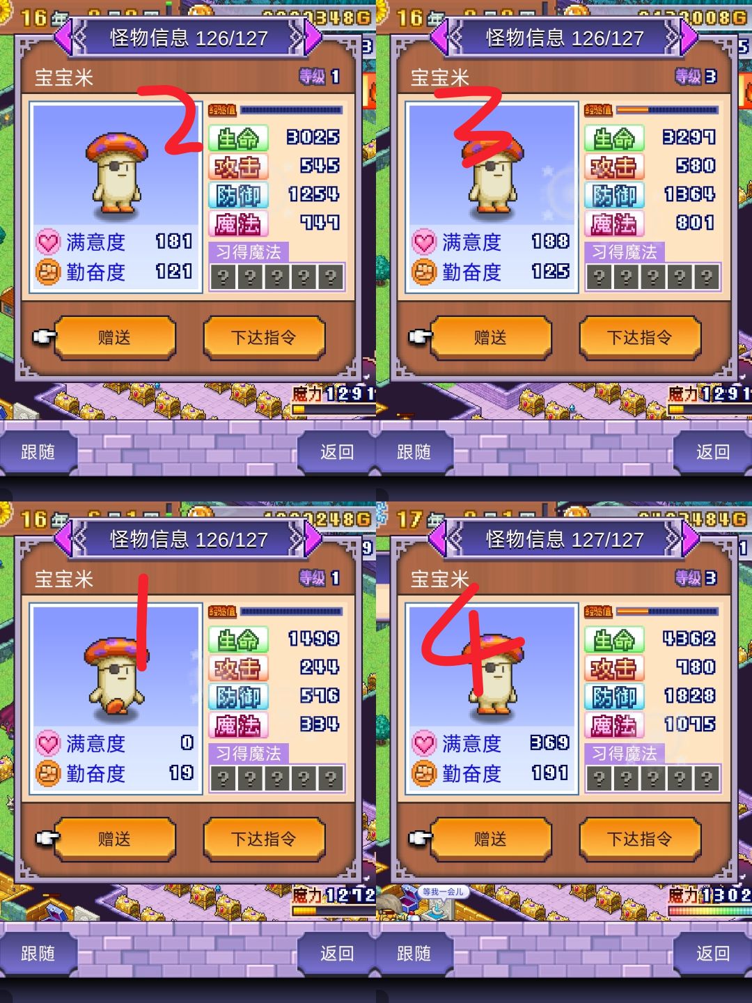 第二和第三幅图中1为初始数值,2为使用29种各一个道具,3为都服用一个红宝石后一个升了2级一个升了1级【可见s级升级反而更慢】,4为使用29种各一个的商店道具属性