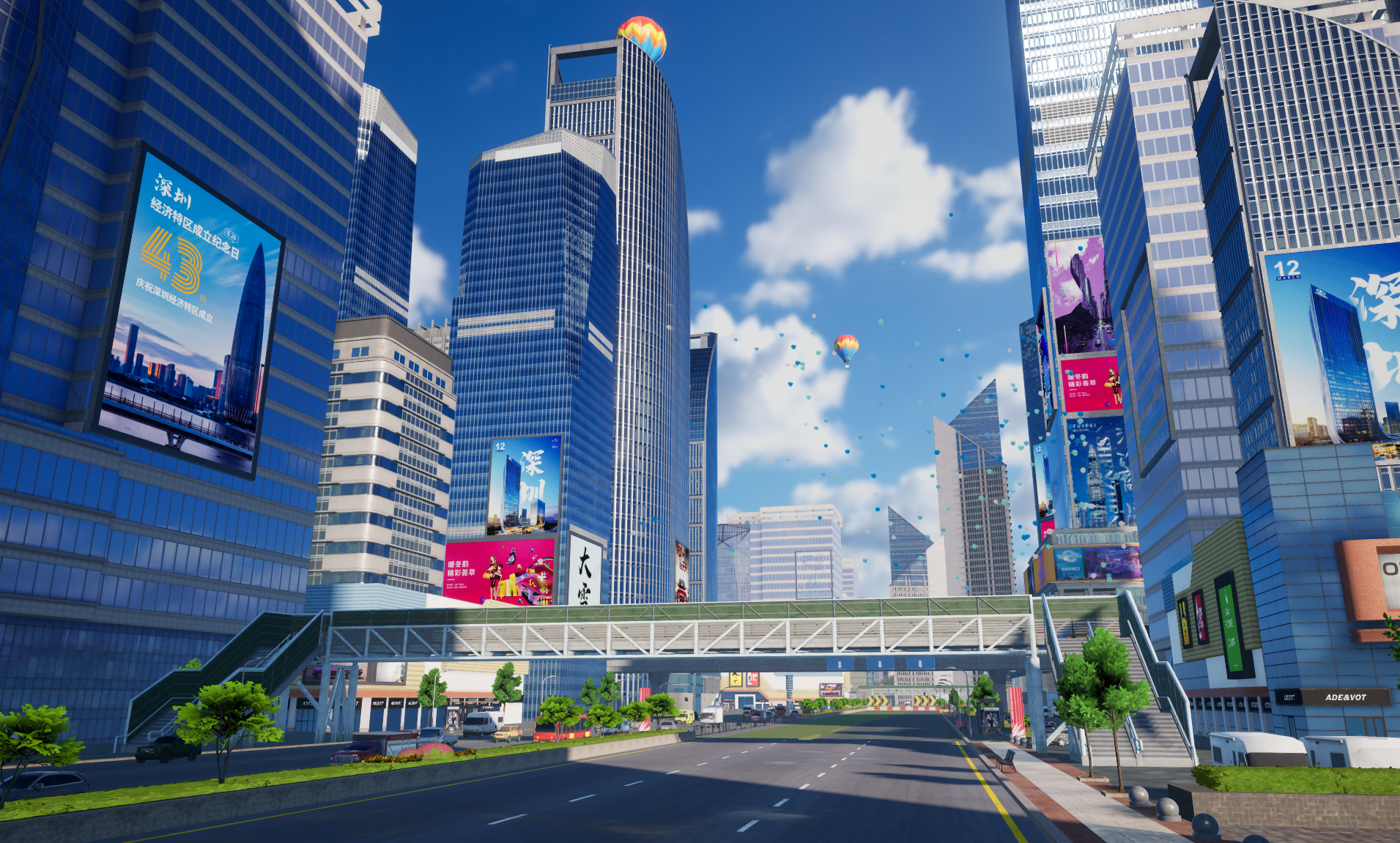 小可点评:欢迎来到“光影深圳”!高楼玻璃幕墙倒映着蓝天,立交桥如流光织成的网络,飞驰在光影交错的虚拟街道上,你能清晰感受到速度与都市节奏的共鸣。