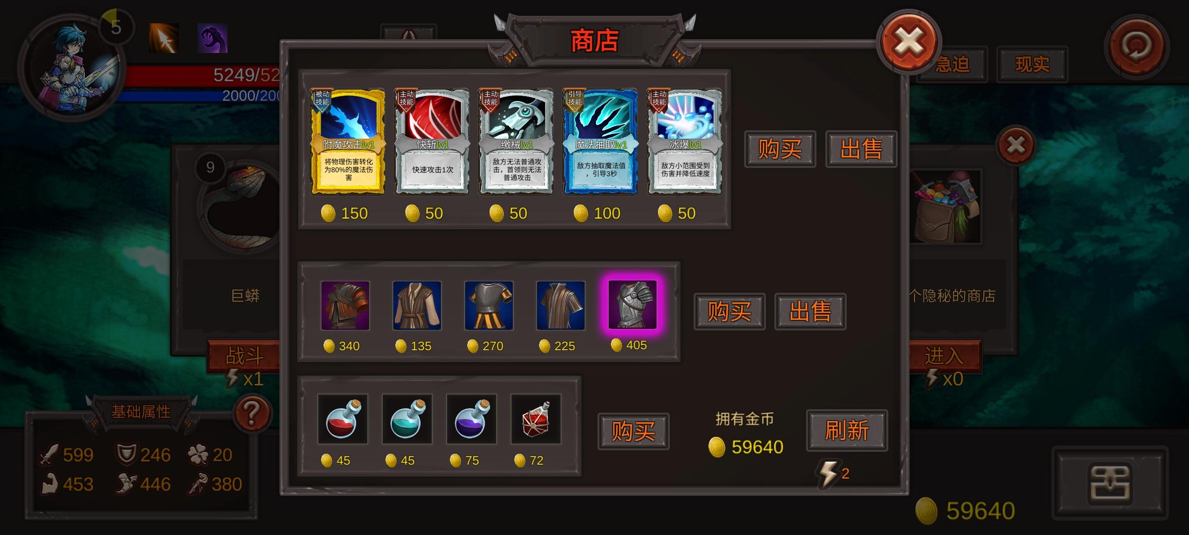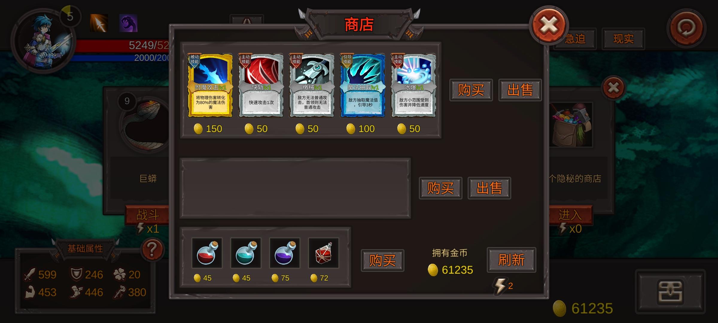 冷知识:商店可不是只能进入一次哦。这算是一个严重bug,你进入非战斗选项可以使用手机返回键返回到游戏的标题界面而不刷新掉该区域。篝火是每次行动后再行动消耗的行动力加1点,但是你返回标题界面重进就可以再进入篝火使用1点行动力去行动,商店就是每次返回标题界面再进入就刷新商品(注意:普通商店这么玩会消耗行动力)。
