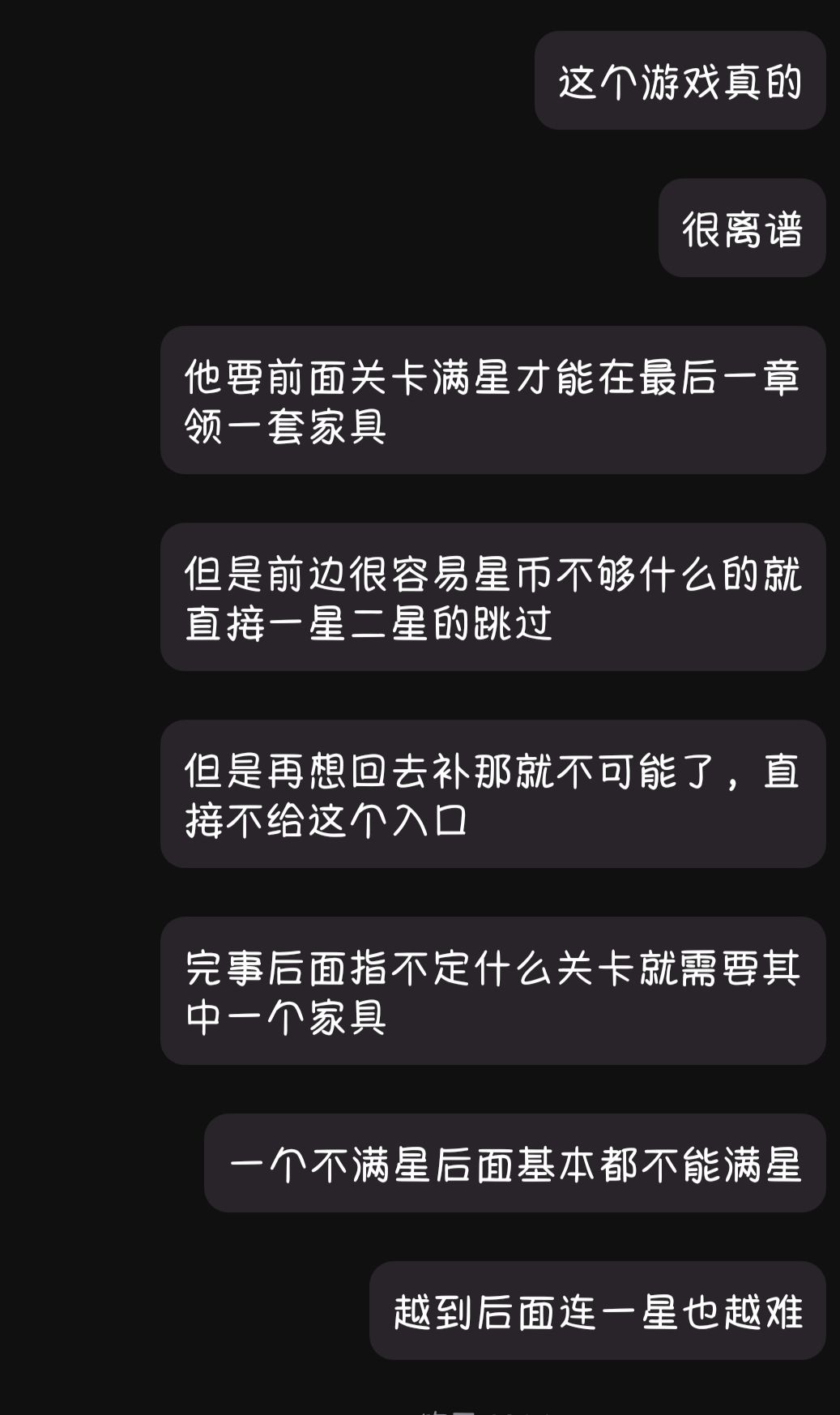 第一天有多爽今天就有多崩溃,前边不满星这点我确实不应该,我应该搞慢一点等一等星币出来之后,买上所有满足的直到三星再继续下一关,中间一梦过去也没有返回上一梦补星机会也行没关系,以为不满星拿不完东西也照样玩,但是这一关这是干什么呢?不搞到那个满星家具直接这一关过不去,这关过不去下面的主线任务也直接全线暂停,什么时候我能返回第四梦拿到满星家具什么时候这一关我才能过去