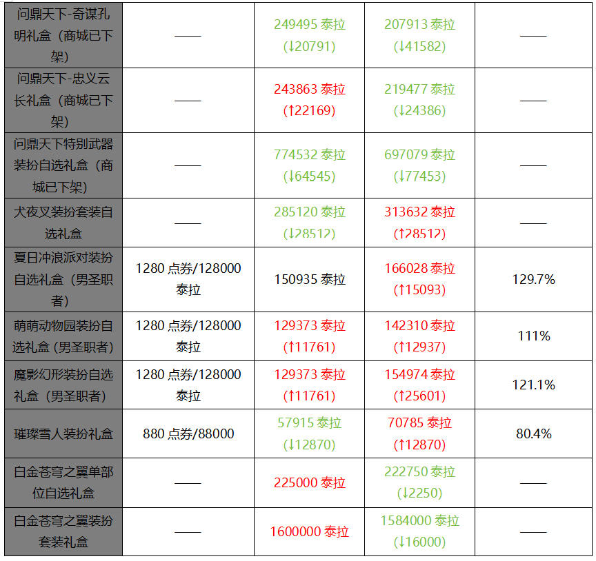 在本周商城道具价格波动比较大,尤其是金秋套和夏日套礼包,价格出现了大幅度的降价,主要是因为春节套爆料为每套打开2个币,而新春币商店又可以兑换前几期的至尊道具,玩家只要在下周购买新春套,收益要远比夏日和金秋套划算的