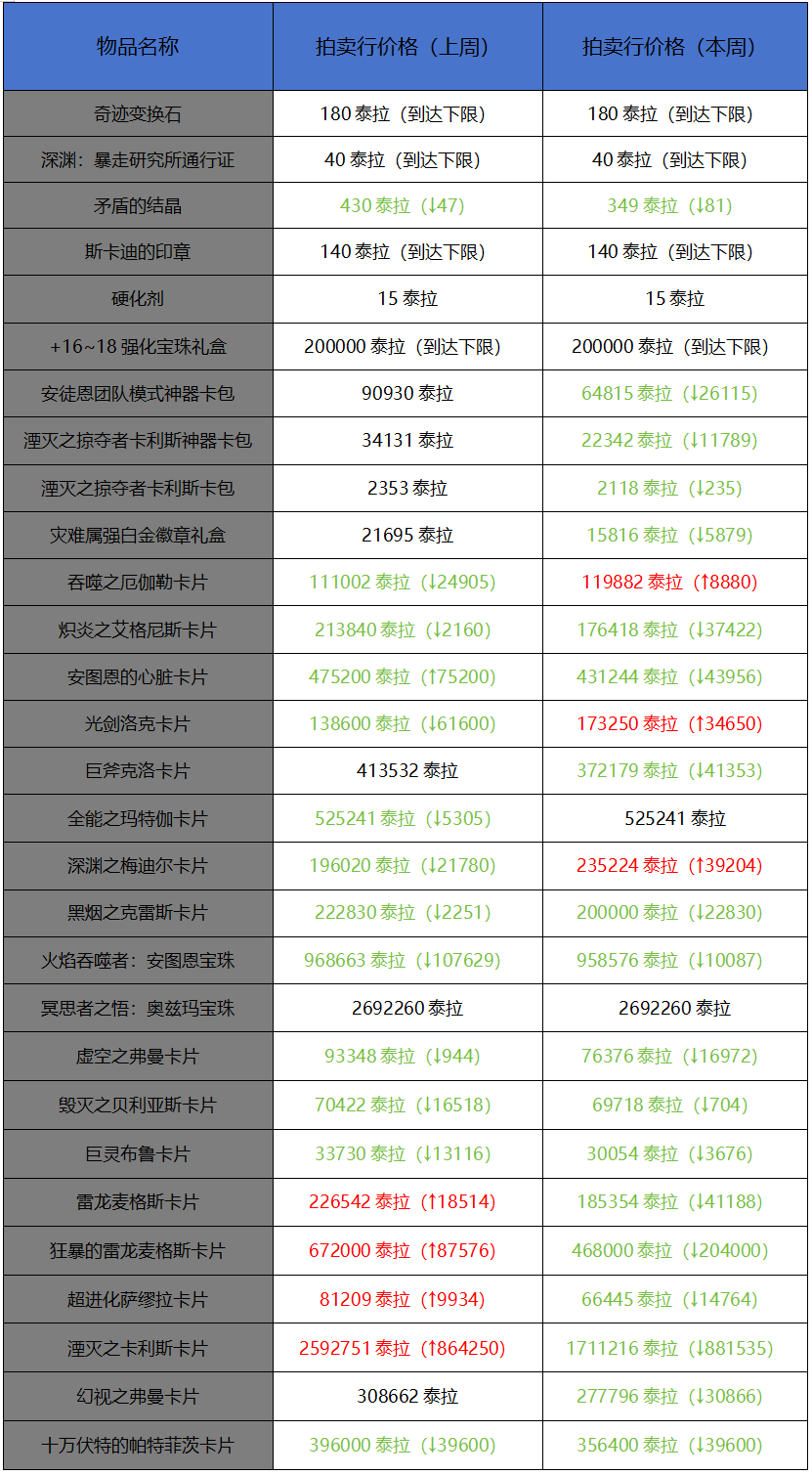 受官方春节版本内容爆料影响,本周拍卖行价格变化很明显,尤其是矛盾,各区价格都出现了大幅度的降价,就连阿甘左在这一周的时间里都降了81泰拉,春节套多买多送会送大量的矛盾,这对于想增幅的氪金玩家来说,拍卖行的矛盾没有太多购买的必要了,这就导致矛盾价格开始疯狂降低,在下周可能会因为新职业的出现价格出现一定的回升,但是最终依旧会继续降低的。