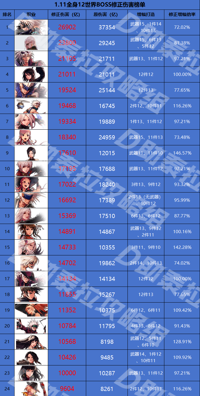 备注:上述排行将所有职业的增幅修正为全身12,已经加入增幅属性中的力智、攻击和技攻,本排行的原伤害数据来源于每周统计的各职业单人世界boss伤害