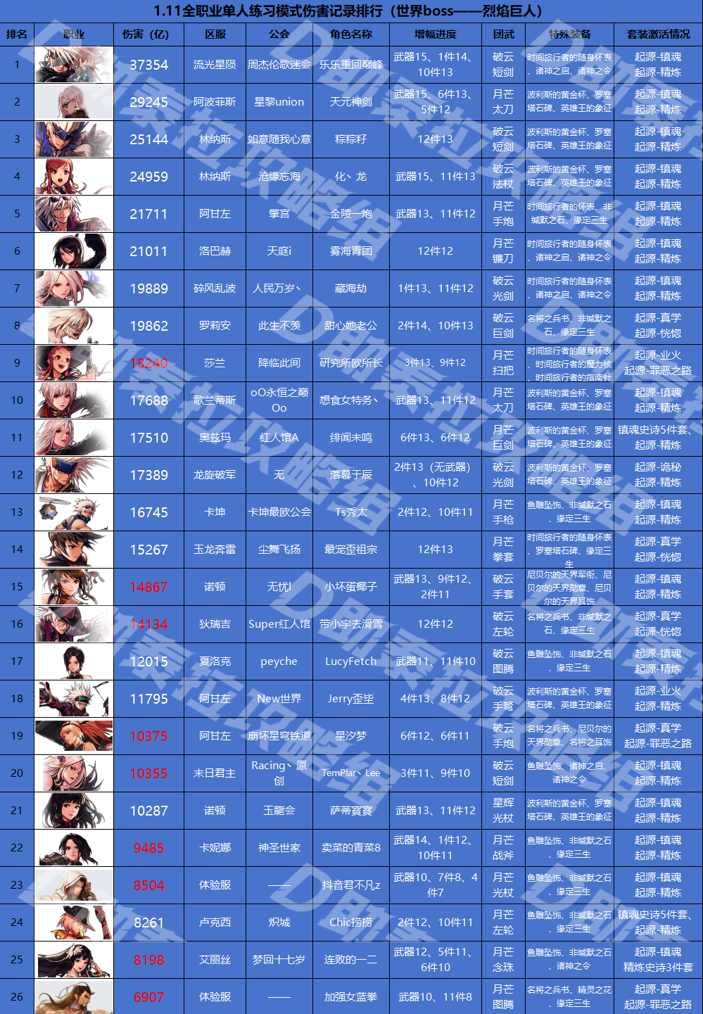 备注:数据截止于1.11,多倍血量土龙,数据来源为网络或者游戏内收集,均有实际截图记录,可能会存在一些记录未及时收集,另外装备打造为排行榜外显装备,与实际打伤装备可能存在差异