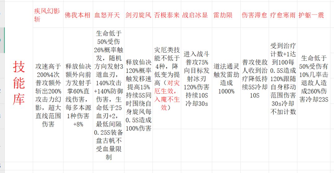我先搭配了一套不成熟的入魔,数值可能不对应,因为找不到一级的和满级的,看到多少级就写了多少。还有几个不重要的没有统计进入技能库