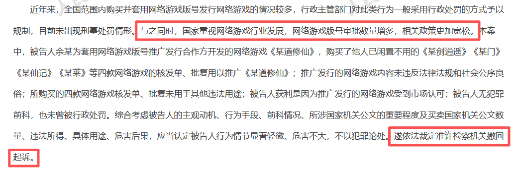 被告人为节省时间而购买他人版号核发单,将4款游戏版号套用于《某道修仙》并上架,涉案流水高达4.8亿元。一审法院曾以“买卖国家机关公文罪”判处余某有期徒刑。 然而在二审期间,检察机关以“情节显著轻微、危害不大,不认为是犯罪”为由撤回起诉,法院准许撤诉。