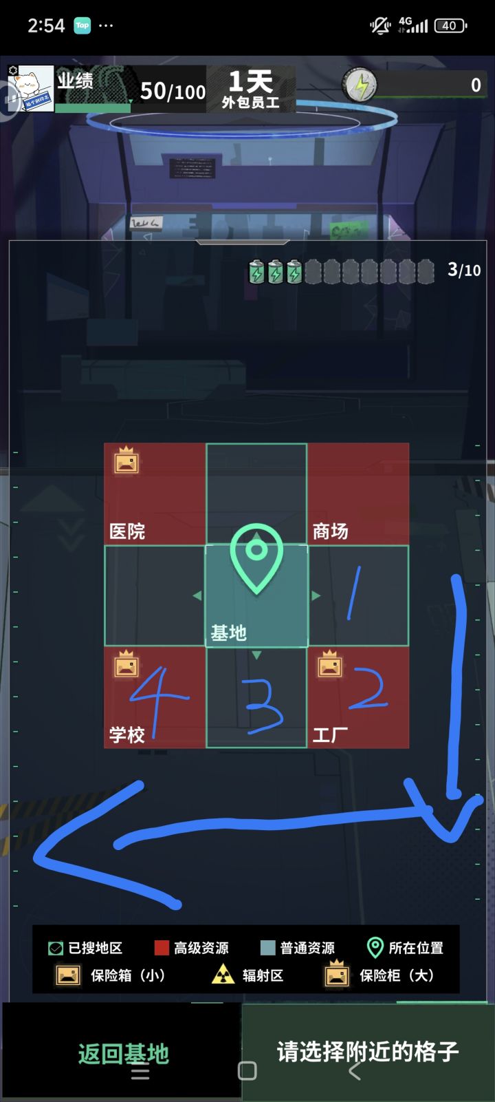 如图3所示,选择1234的顺序搜索,如果1234搜完没有什么东西,考虑要不要继续顺时针搜索,如果连续搜6次,之后的有广告奖励箱子的日子可以只搜两个地方补回来体力,前期囤积一部分体力,保证在后期,每天只有三体力的情况下可以进行四次搜索。