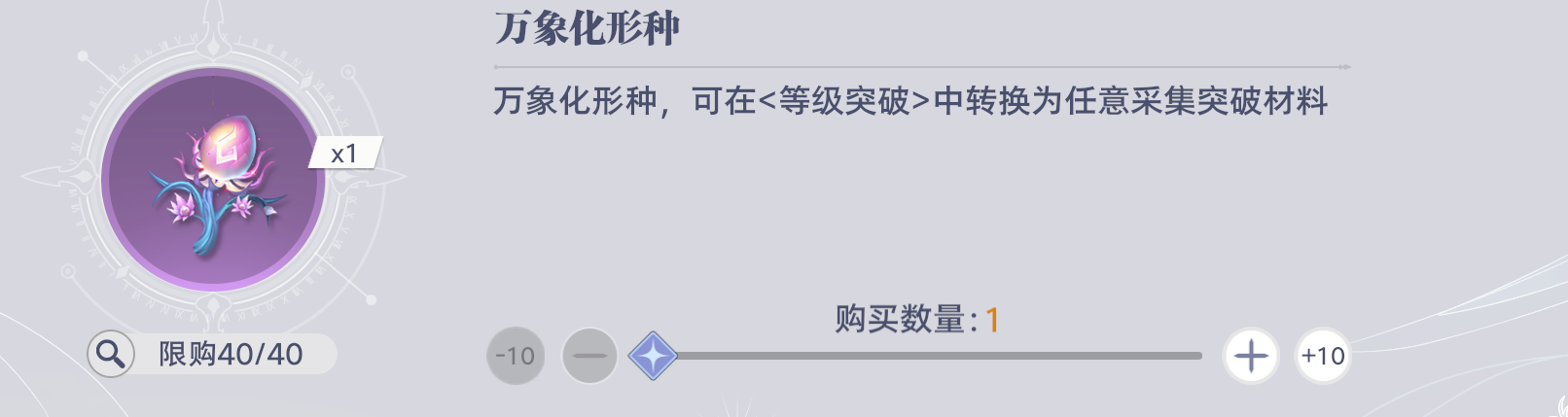 万象化形种:1个可节省20点体力,用于转换武魂等级突破材料,仅当上述所有道具兑换完毕后,用多余兑换币按需兑换,提升养成效率。