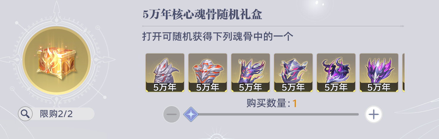 5万年核心魂骨随机礼盒:魂骨突破狗粮,仅当主力魂骨急需升级、且兑换币充裕时考虑,非刚需可暂不兑换,避免占用核心道具兑换资源。
