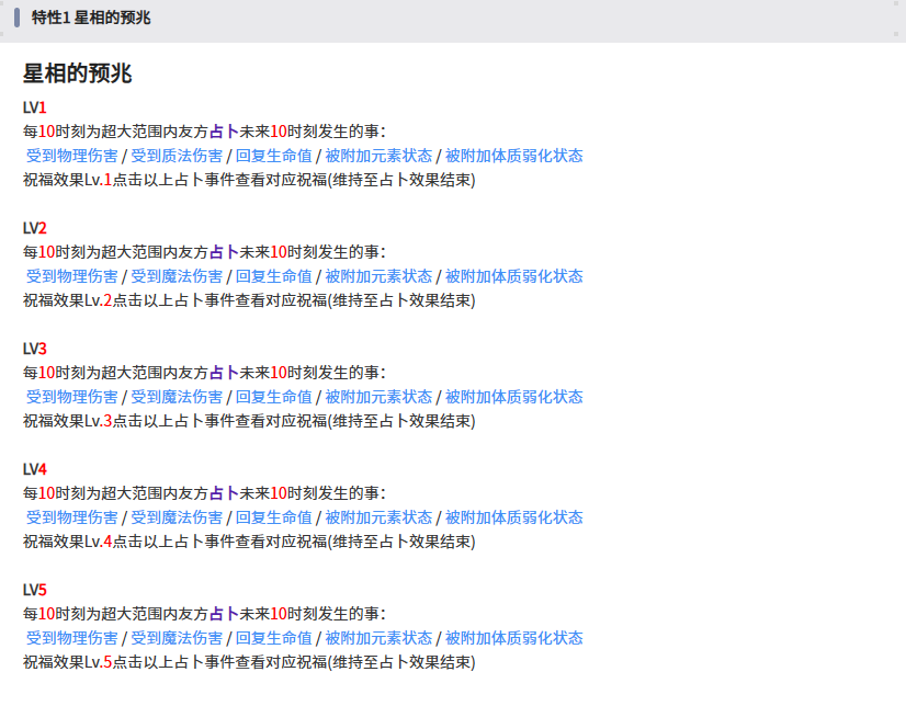 特性2 当成功占卜特性1的事件时,会给队友提供buff还会再次留下星光