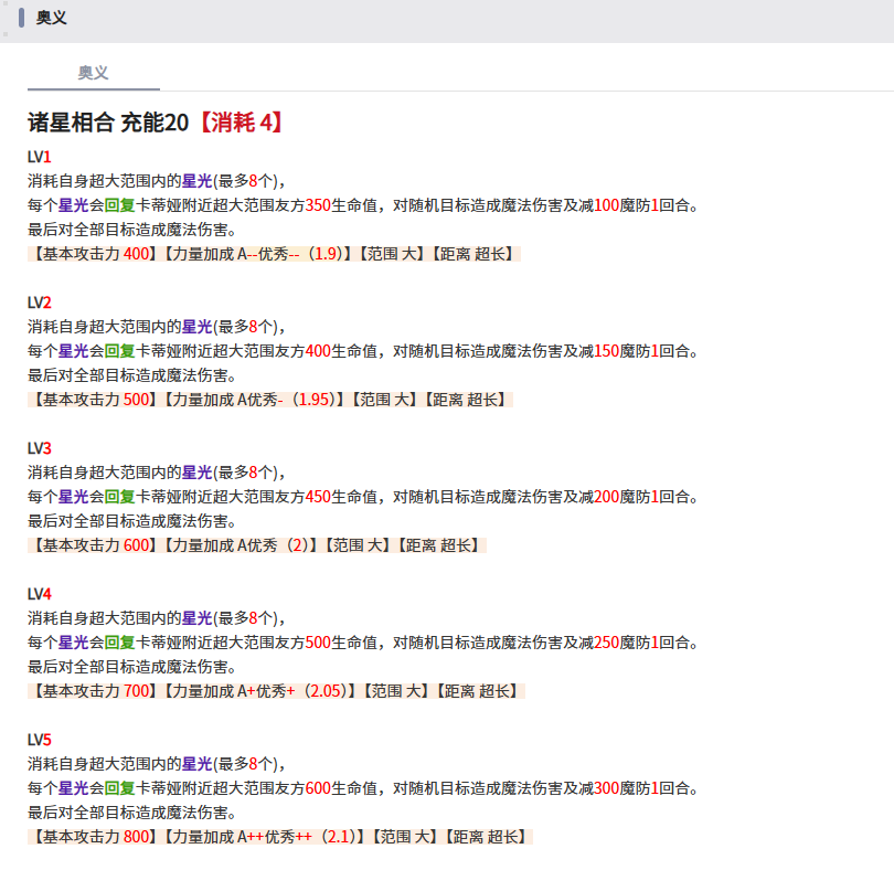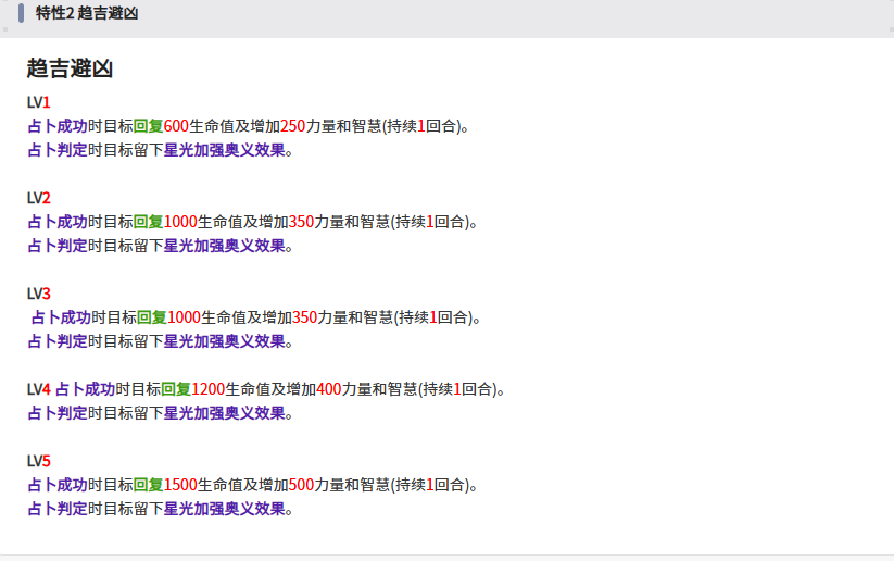 这五种状态分别是受到物理或魔法伤害(时大幅减伤),恢复生命值时(加速),被附加异常状态和弱化状态(时立即解除),只要满足了上述条件的条件,便会触发占卜,占卜成功时目标回复1500生命值及增加500力量和智慧(1回合),并且周围会掉落星光,这个星光则是奥义的补充条件,奥义每消耗一个星光便会多回一次血+多额外一次随机攻击。