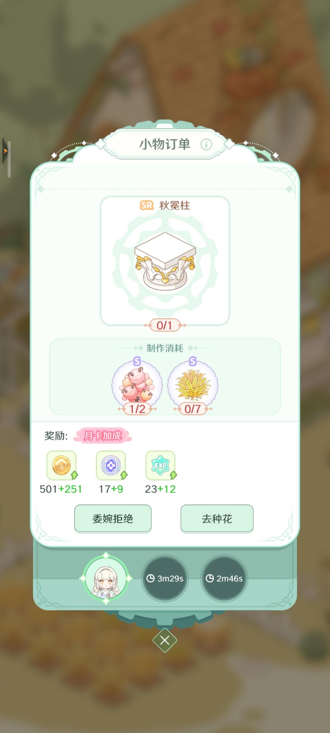 最后提醒一下缺紫币的宝宝们,小物订单可以把紫币少的订单刷掉,只做s级以上家具的订单。在每天的几十次双倍没用完之前,拒绝再回来的时间只有一分钟,双倍用完之后是五分钟,所以那几十次双倍尽量都做高紫币的任务。