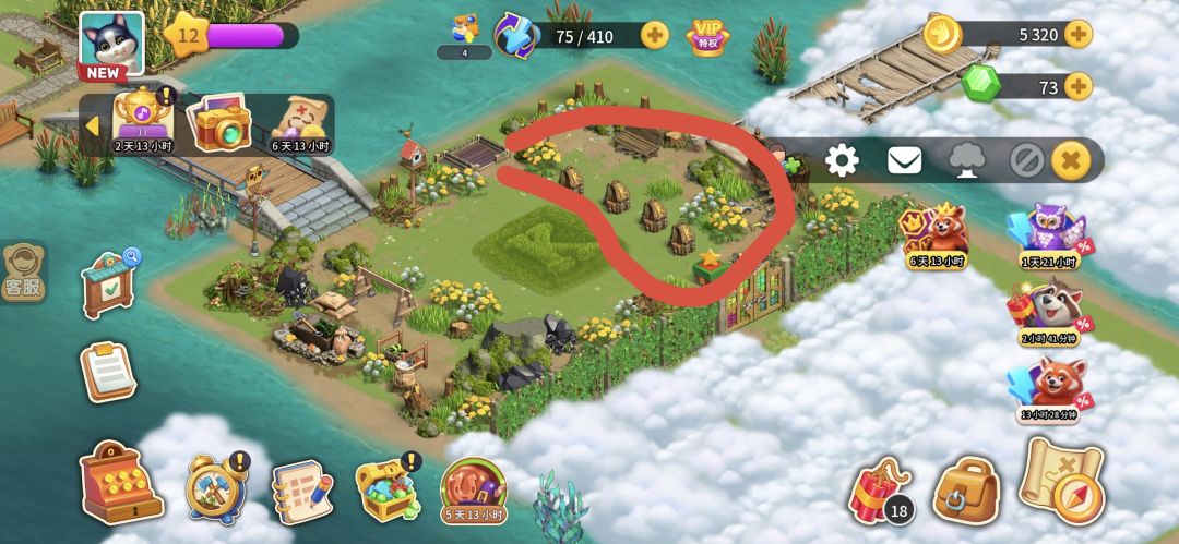 当前地图任务完成之后一定要把有用的资源开采完再去下一个地图,不然地图会在24小时后关闭,云朵遮住的地方尽量打开,然后点图二圈出来的地方,把遮挡的石头树木屏蔽,小箱子小背包都点掉。活动期间主线地图尽量不要去开采,专心肝限时的活动,地图上的能量包(还有礼品盒图五)活动先不要去点,等到地图上出现能耗打折时再去点。还有,12级之后牛奶和鸡蛋就不会缺了。总之这是个需要肝的游戏🤣