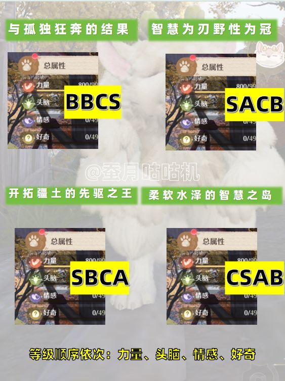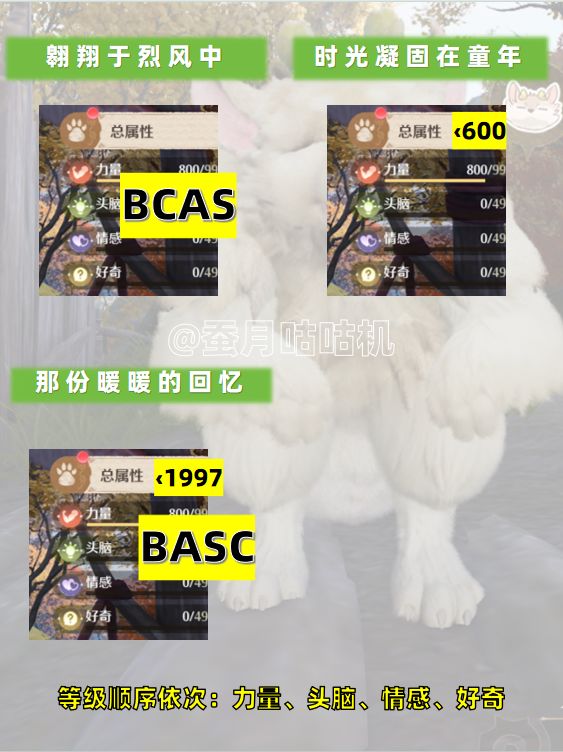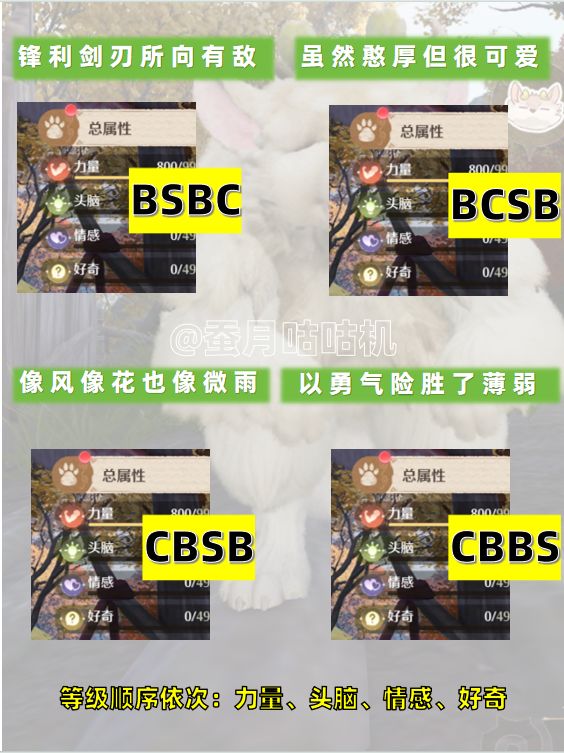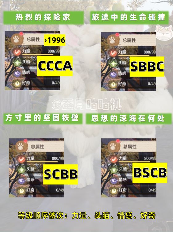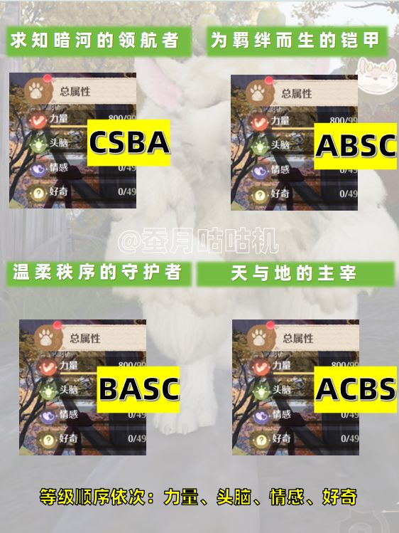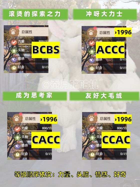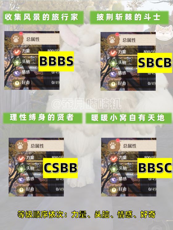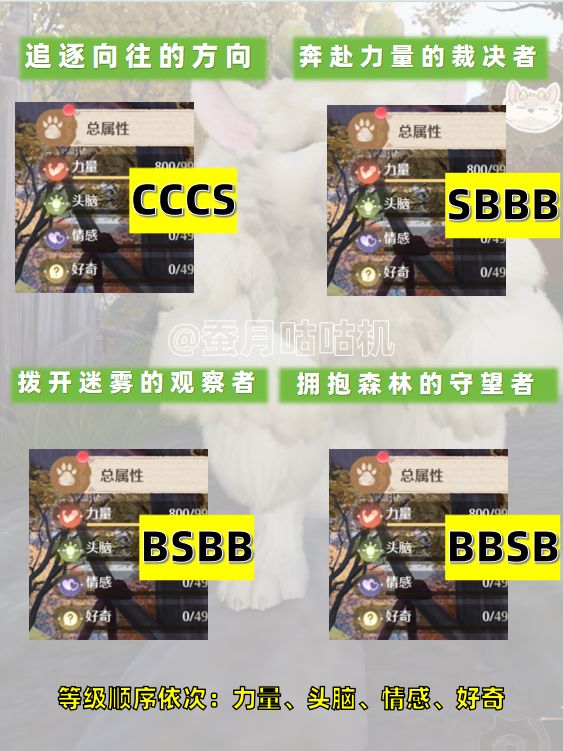 🌱需要特别注意『冲呀大力士』到『热烈的探险家』这四个结局,可以直接按照图上等级养成即可,偶尔其他属性超过C变成B也是可以的(但不能大于A),只要主属性最高且A就行