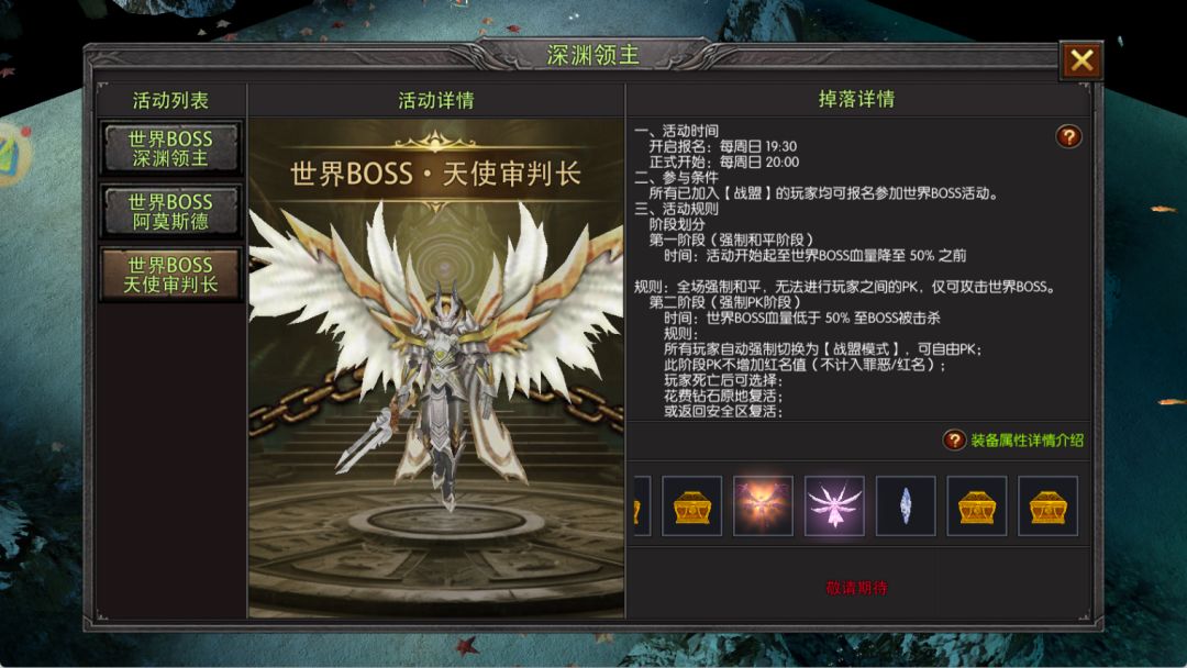 - 👑 世界 BOSS 争夺战:周日 20:00 开启,产出 4 属性卓越装备、果实自选箱,极品道具可遇不可求;