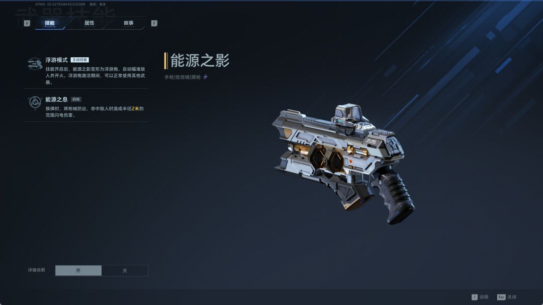 能源之影是一把单发伤害119,前置弹量18,总弹量162的半自动金色品质副武器,属于电弧元素类型的低倍镜手枪。换弹时,会将枪械扔出,命中敌人时造成半径2米的范围闪电伤害。