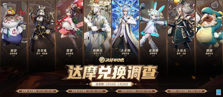 活动投票结束后,大人们票选出的人气皮肤即将陆续加入达摩降福兑换,大人们可别错过啦~