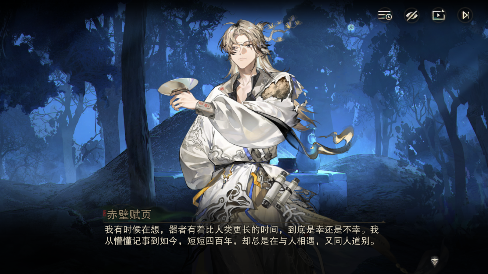 可能有的收藏家会说,那他们可以把自己心中的赤壁赋页形象告诉给其他人,这样就还会有别人记得他眼中的赤壁赋页了。其实我前面提到的这些人,在剧情里都或多或少有对旁人提及过赤壁赋页,但是我们可以看到,赤壁赋页依旧会遗忘。为什么?举个例子吧,你和你妈妈说物华弥新是个特别好的游戏,赤壁赋页更是帅得没边,巴拉巴拉此处省略很多字,总之你把你的认识毫无保留地全说了一遍。那么你妈妈眼中的物华弥新和赤壁赋页,和你眼中的真的就完全一致吗?所以,这种转述只能算是新的传承,而非早先的代替。